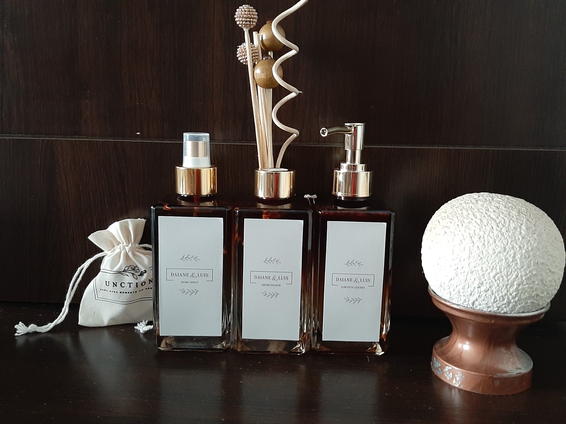O kit contém sabonete líquido,  home spray e difusor vareta. Elaboramos a arte de acordo com a sua necessidade. Temos 104 opções de fragrâncias.